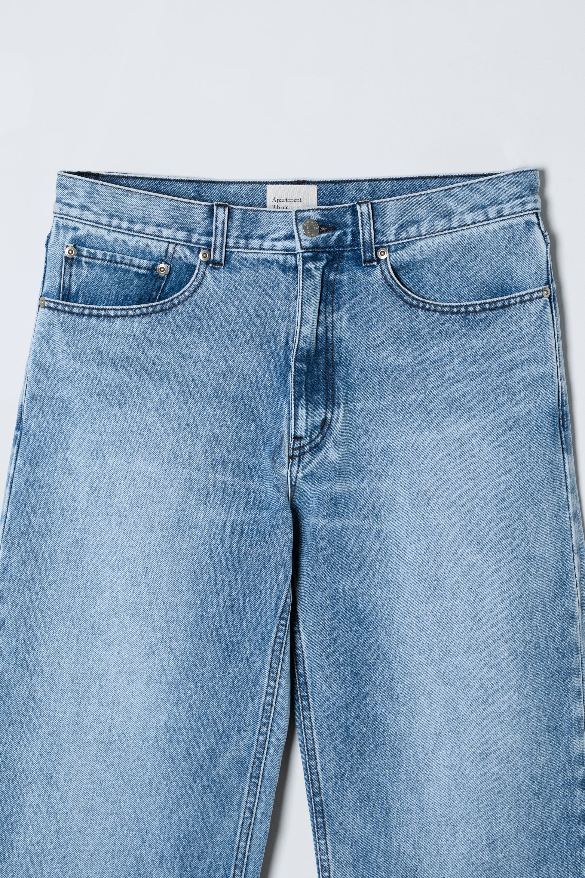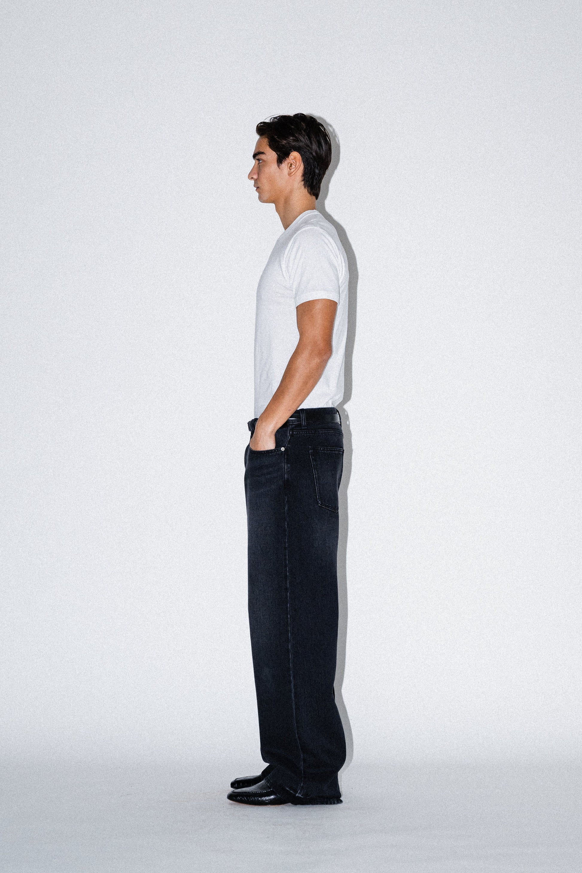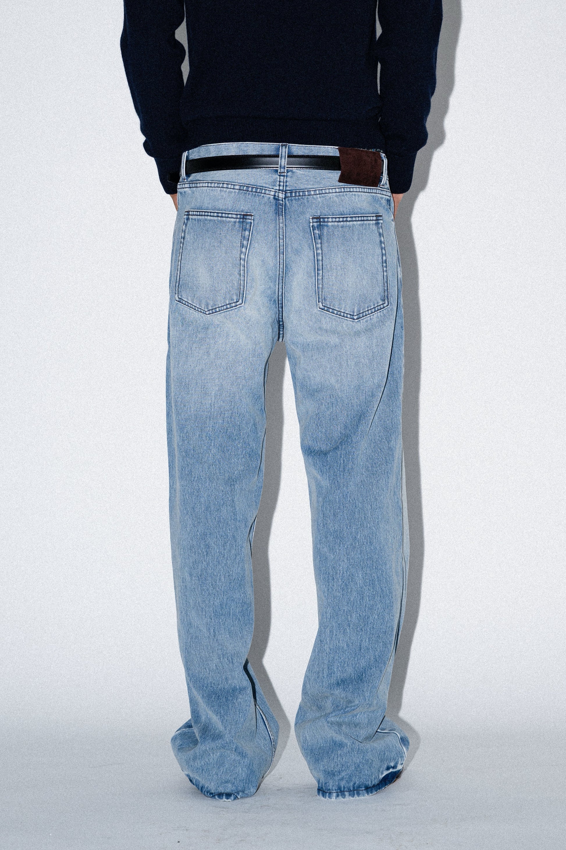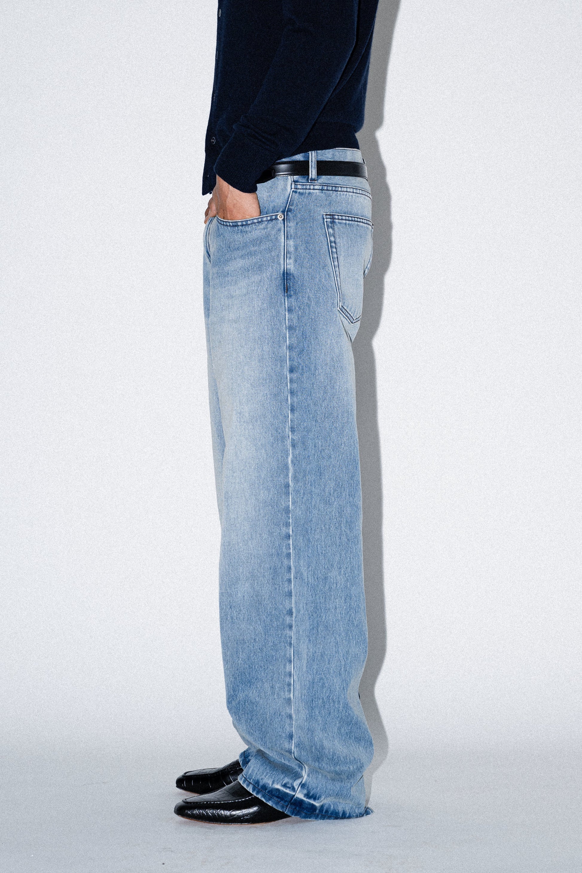 やや浅めの股上と、腰にかかる位置でバランスよく穿けるシルエットが特徴のワイドレッグジーンズ。